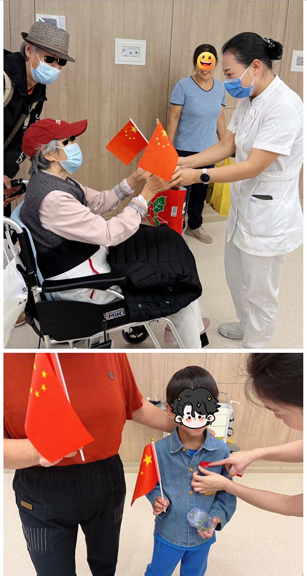 科室里处处飘扬着鲜艳的五星红旗,医护人员身着白大褂,手持小国旗,脸上的爱国贴纸与真挚笑容交相辉映,用热忱表达对祖国的深情祝福。他们不仅将小国旗送到患者及家属手中,更细心为小患者在衣襟别上国旗徽章,与老年患者亲切握手传递国旗,让“中国红”成为病房里最温暖的底色,医患在这抹红色中共同抒发家国情怀。