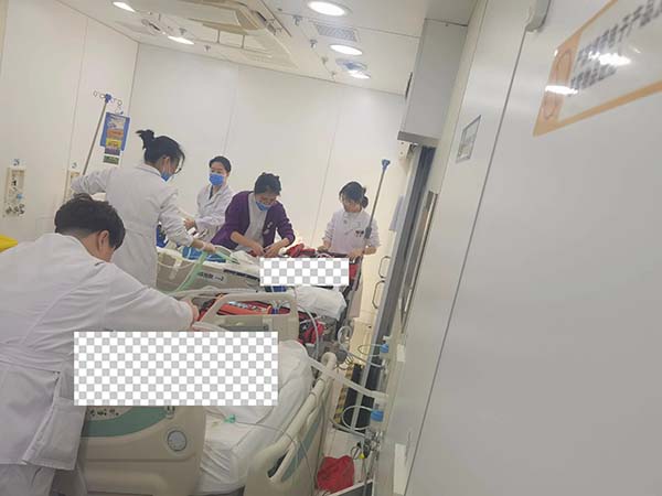 病例一:53岁女性患者,被发现意识不清2天,就诊后明确为急性一氧化碳中毒。此前在外院已行气管插管及呼吸机辅助通气,经120转运至朝阳医院急诊。入院时患者呈浅昏迷状态,合并呼吸衰竭与休克,病情危重复杂。高压氧科团队迅速响应,与急诊抢救室医护人员协同开展紧急救治。全程使用转运呼吸机陪同患者完成CT检查,综合评估后立即启动紧急开舱流程。值班医护迅速集结,采取“一医一护”陪舱模式,应用氧舱呼吸机保障高压氧治疗顺利实施。