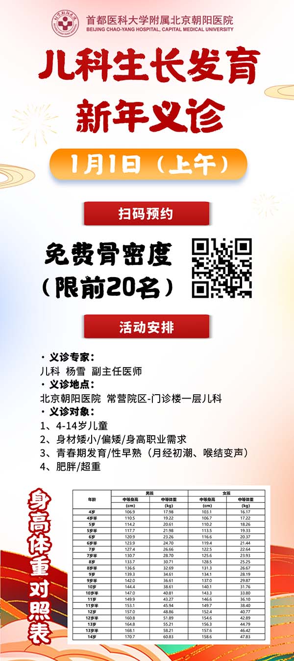 新年将至,为成长加把劲!为关爱儿童健康成长,北京朝阳医院儿科将于1月1日(元旦)上午举行“迎新年,助成长”儿童生长发育义诊活动。