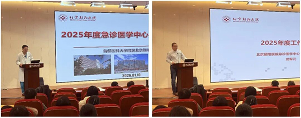 2026年1月10日(周六)上午,常营院区科研教学楼报告厅内气氛热烈,北京朝阳医院急诊医学中心全体医护人员(在岗人员除外)齐聚一堂,认真听取三院区六位分管主任与四位护士长的年度工作汇报。与会人员为急诊医学中心一年来取得的成绩感到无比自豪,也对发展中存在的不足展开深刻反思。2025年,急诊医学中心实现战略意义上的稳步发展,各项工作推进与医院七年发展规划高度契合、同频共振。