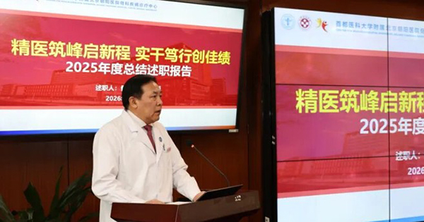 大会最后,海涌提出了骨病中心2026年高质量发展蓝图。他指出,面对“十五五”规划谋篇布局的关键节点,骨病中心将全面实施“核心引擎·双轮驱动”战略,深化“一院三区”差异化布局,以打造“中国北方脊柱畸形诊疗中心”“京西创伤与老年脊柱微创中心”“复杂关节疾患诊治中心”及“国家级微创培训基地”为目标。在医院党委的坚强领导下,北京朝阳医院骨病中心全体同仁将继续秉承“精医重道、和合致远”的院训,践行“大学科引领、小专科深耕”的发展理念,以“骨科共同体”建设为核心引擎,奋力打造国内领先、国际知名的骨病诊疗中心。