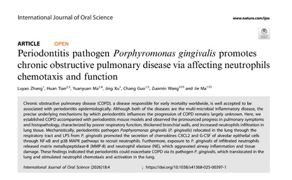 在牙周炎与呼吸系统疾病的相关性研究领域,王左敏团队与北京医院马洁团队开展深度合作,在口腔医学领域国际权威期刊International Journal of Oral Science(影响因子12.2)上发表题为“Periodontitis pathogen Porphyromonas gingivalis promotes chronic obstructive pulmonary disease via affecting neutrophils chemotaxis and function”的研究论文。该研究系统揭示了牙周炎关键致病菌——牙龈卟啉单胞菌促进慢性阻塞性肺疾病(COPD)进展的分子机制。研究团队成功构建牙周炎合并COPD的小鼠模型,证实牙龈卟啉单胞菌可通过呼吸道定植于肺部,其脂多糖成分能够激活肺泡上皮细胞内的NF-κB和p38 MAPK信号通路,促进趋化因子CXCL2及粒细胞集落刺激因子的分泌,进而诱导大量中性粒细胞向肺部浸润。深入机制研究表明,这些被招募的中性粒细胞在牙龈卟啉单胞菌刺激下释放基质金属蛋白酶-8和中性粒细胞弹性蛋白酶,加剧气道炎症反应和组织损伤,最终导致肺功能显著下降。该研究阐明了口腔微生物影响肺部疾病的关键途径,为通过口腔健康干预辅助管理COPD提供了重要理论支撑,提示临床诊疗中应重视口腔健康状况对呼吸系统疾病的潜在影响,为制定多学科联合诊疗策略奠定基础。