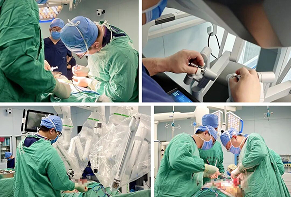 第一棒为机器人辅助下肾脏切除术:郑鑫在严重粘连的腹腔内精细游离肾脏,在达芬奇机器人系统放大10倍的视野下,逐一解剖脆弱如纸的肾动静脉,用钛夹夹闭离断后,将病肾完整切除,本应是手术中最简单的一步反而成了最艰难的一步。