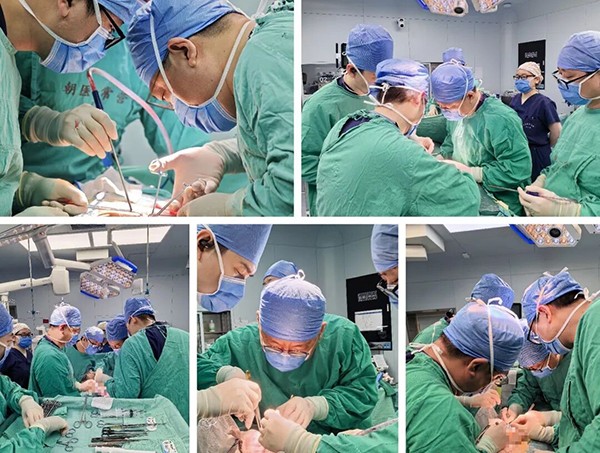 手术历时整整12小时,一场与死神的殊死搏斗正式展开。手术由郑鑫团队和泌尿外科副主任王伟团队共同主刀,完成一系列的肾脏切取、移植肾修整、异体血管静脉延长、肾脏移植及输尿管重建等。严重的腹腔粘连让手术入路异常困难,腹腔镜下可见,腹腔内原本清晰的解剖结构被脓性渗出和炎性瘢痕完全掩盖,肠管粘连成团,输尿管已失去原有形态,仅残留糟烂的纤维组织。
